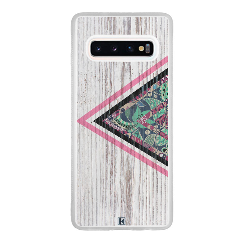 Coque Galaxy S10 avec design “Triangle on white wood”.