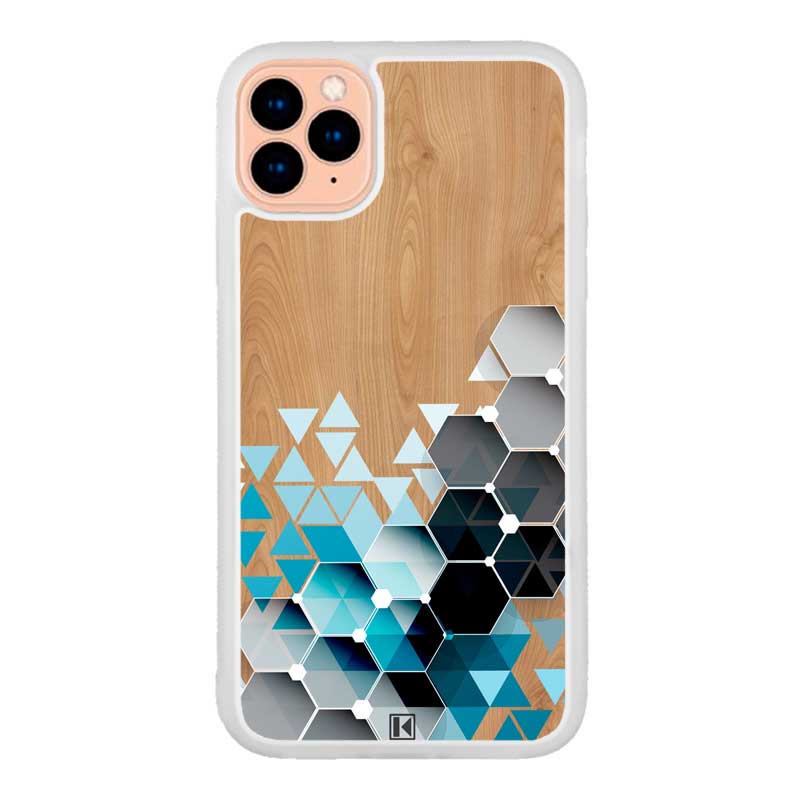 Coque iPhone 11 Pro avec design “Blue triangles on wood”.