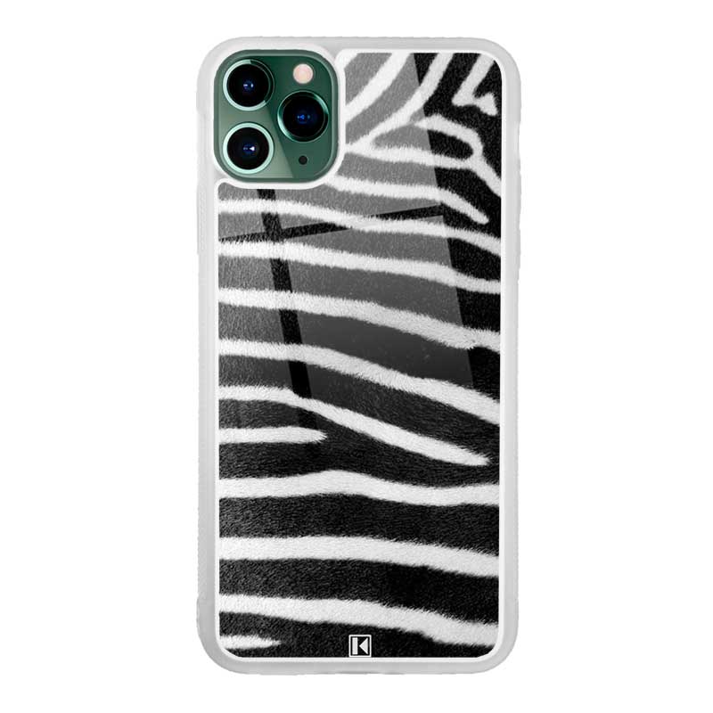 Coque iPhone 11 Pro Max avec design “Zebra Leather” et finition en verre trempé.