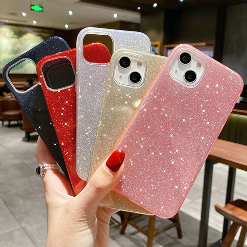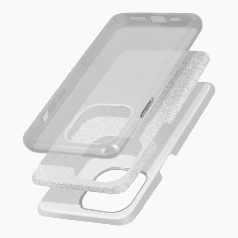 Cette coque est composée de trois parties : Une coque en silicone, un film pailleté puis une fine plaque en polycarbonate rigide.