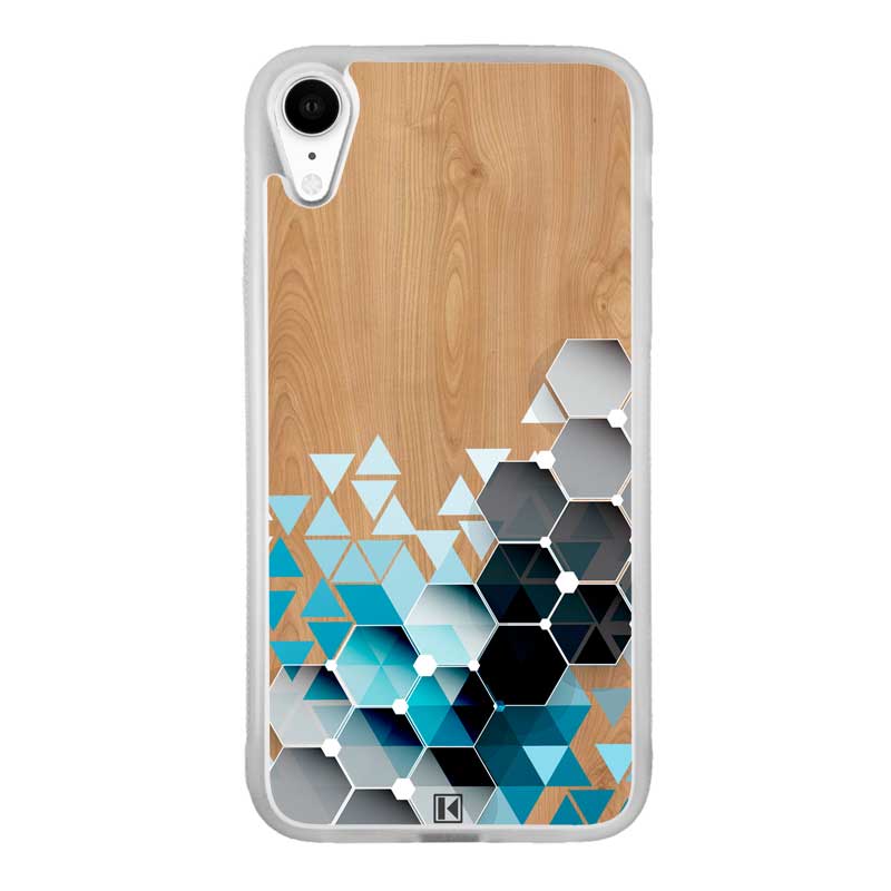 Coque iPhone Xr avec design “Blue triangles on wood”.