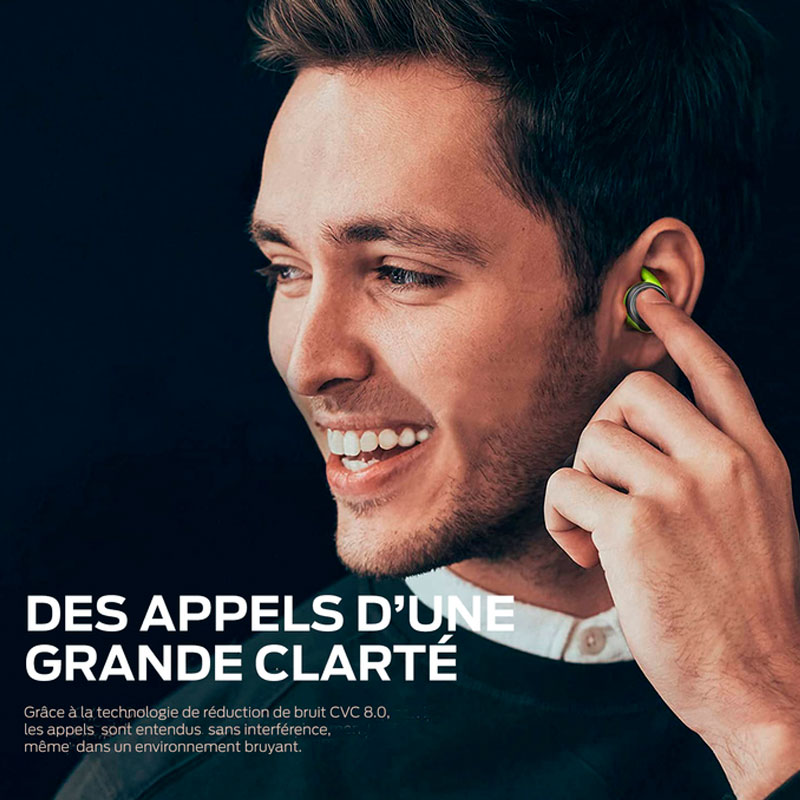 Les écouteurs sans fil avec technologie d’annulation de bruit cVc 8.0 bloquent efficacement le bruit de fond et captent avec précision votre voix, de sorte que vous êtes entendu clairement sans interférence, même dans un environnement bruyant.