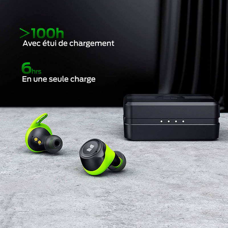 Les écouteurs Bluetooth offrent jusqu’à 6 heures de musique en continu avec une seule charge complète. L’étui de chargement de poche intègre une batterie 2600 mAh pour fournir l’équivalent de 17 charges complètes et jusqu’à 100 heures d’utilisation. La technologie de charge rapide de type USB-C permet 1 heure d’écoute après seulement 5 minutes de charge rapide.