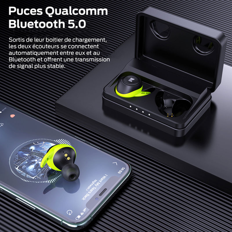 Les écouteurs Bluetooth résistent à la sueur, à l’eau et à la pluie. La conception ergonomique dans l’oreille, fait qu’ils ne tombent pas des oreilles et restent en place, parfaits pour le sport, la course, la conduite, l’entraînement, la gym, la relaxation, les voyages, etc.
