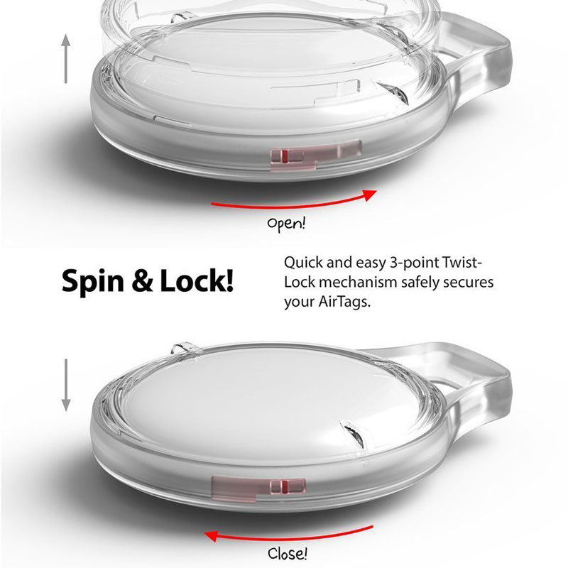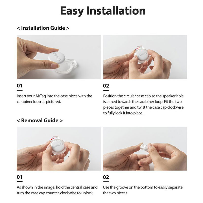 Le placement de l’AirTag dans le boîtier ne prend que quelques secondes, grâce au mécanisme d’ouverture et de fermeture pratique. Il suffit de séparer la coque avant et la coque arrière de la protection et de placer votre AirTag à l’intérieur.