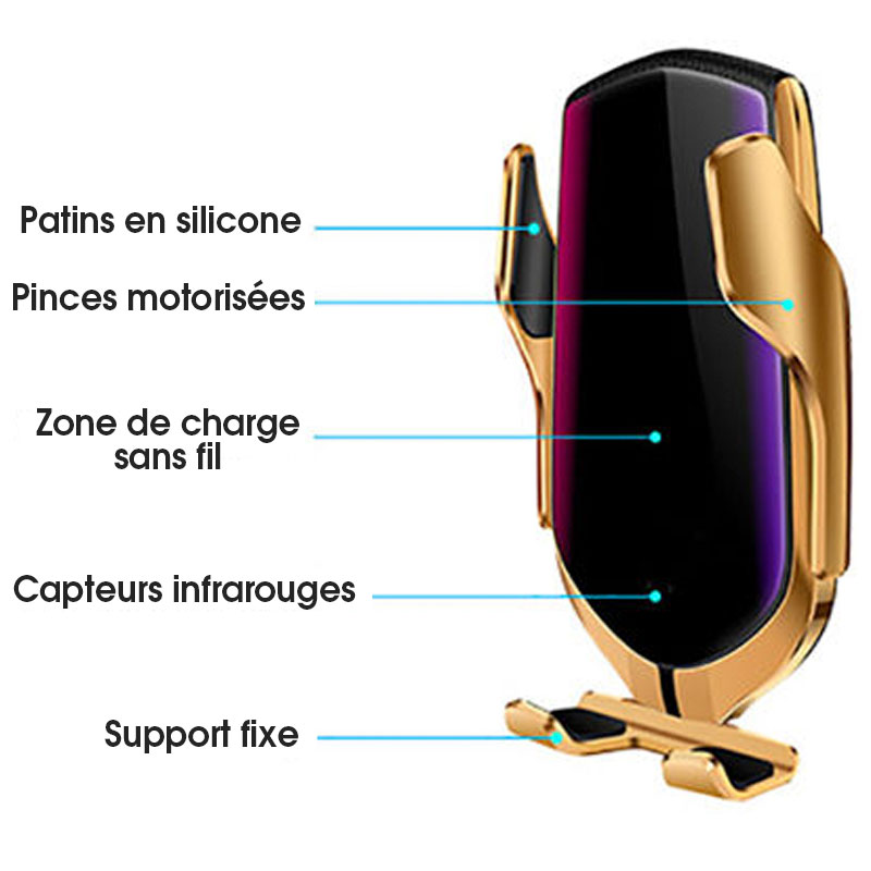 Les capteurs infrarouges placés à l’avant du support déclenchent automatiquement l’ouverture des pinces motorisées à l’approche de votre téléphone.