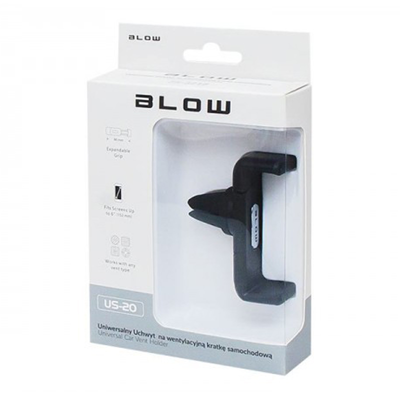 Ce support de voiture universel Blow US-20 possède un mécanisme d’écartement permettant la compatibilité avec tout type d’appareil allant jusqu’à 5.5 pouces maximum.