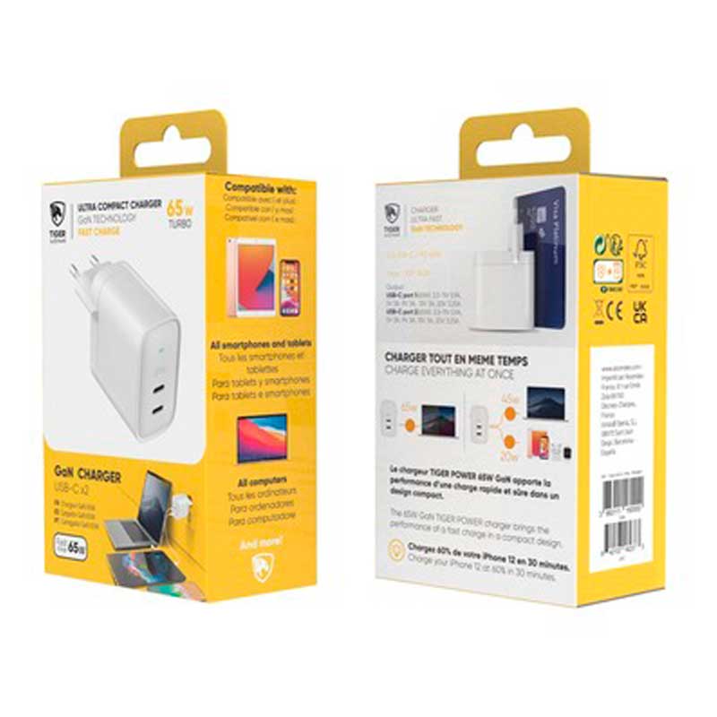 TIGER POWER – Chargeur secteur 65w double USB-C – Blanc
